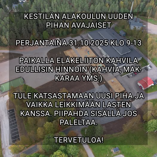 Pidämme perjantaina 31.10.2025 Kestilän alakoulun uuden pihan avajaiset klo 9:00 – 13:00. Kestilän eläkeliitto on paikalla pitämässä kahvilaa. Oppilaat voivat ottaa mukaan vähän rahaa, niin voivat ostaa mm. kahvia, mehua, makkaraa, lättyjä. Huoltajat ja muu kylän väki on myös tervetullutta paikalle. Koulun sisällä voi käydä lämmittelemässä, jos tulee kylmä.