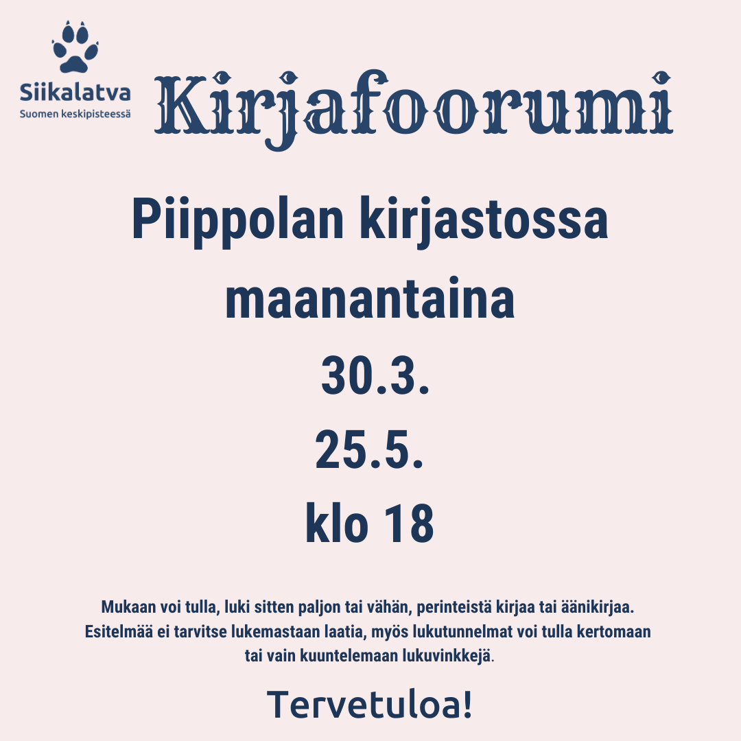 Piippolan Kirjafoorumi kokoontuu keväällä 2026: 30.3., 27.4. ja 25.5. klo 18.