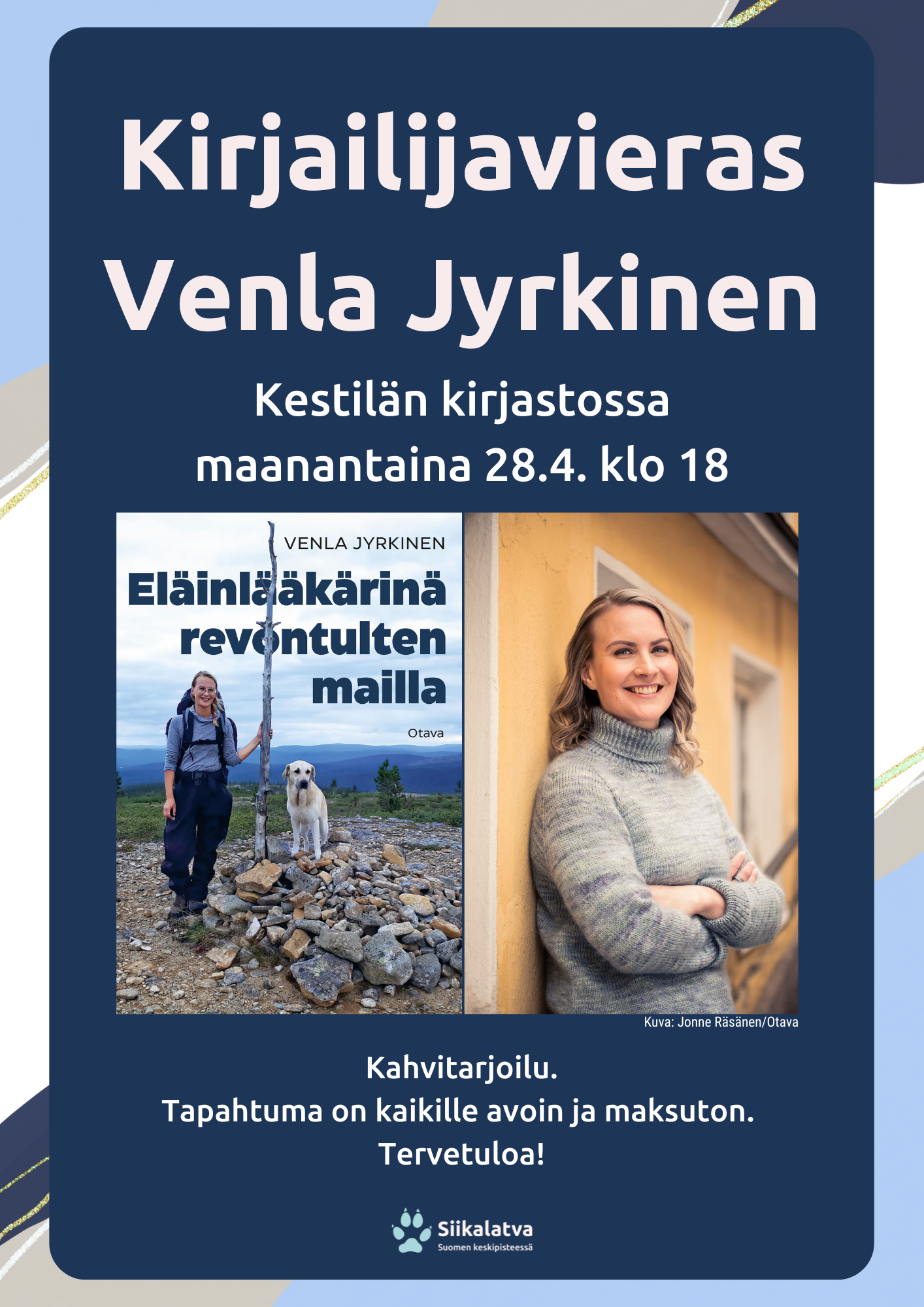 Venla Jyrkinen on Inarissa asuva ja työskentelevä eläinlääkäri, joka on opiskellut eläinlääkärintyönsä ohella kirjoittamista. Jyrkiseltä on äskettäin ilmestynyt kirja ”Eläinlääkärinä revontulten mailla” (Otava, 2025). Kirja käsittelee Venlan elämää eläinlääkärinä Pohjois-Lapissa. Elämäkerrallinen kirja kertoo Venlan kokemuksista Inarissa ja kirjaan mahtuu myös muistoja Siikalatvan Kestilästä, missä kirjailija on viettänyt aikaa isovanhempiensa luona. Kirja onkin herättänyt kiinnostusta myös Siikalatvalla!