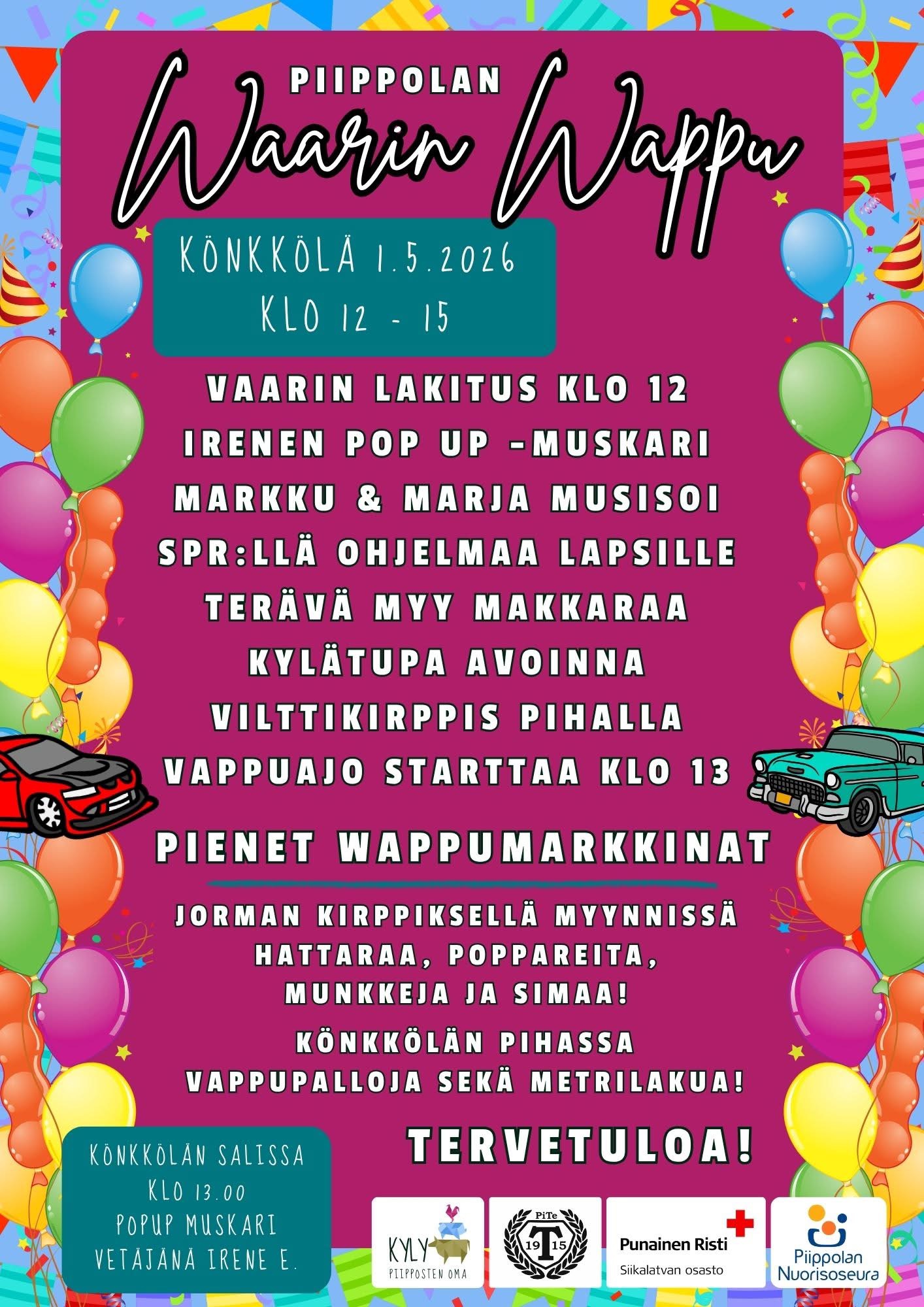 📣 Waarin Wappuajot 2026 kylän raitilla ja lopuksi ajoneuvot esillä Könkkölän ja kirjaston pihalla. Wappuajoihin ovat tervetulleita kaikki kulkuneuvot, niin vanhat ja legendaariset kuin uudet ja tuunatut. Mopot, moottoripyörät, traktorit, autot, kuorma-autot… 🛵🏍️🚘🛻🚜🚗🚌 Kaikki mukaan hyvän mielen ajelulle!