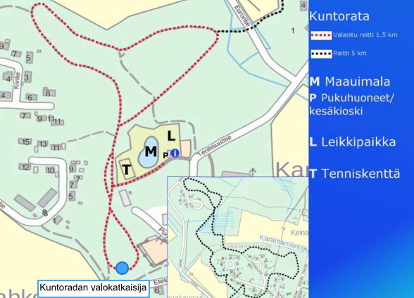Lehtomäen kuntoradan valokatkaisijan sijainti (latujen valot).