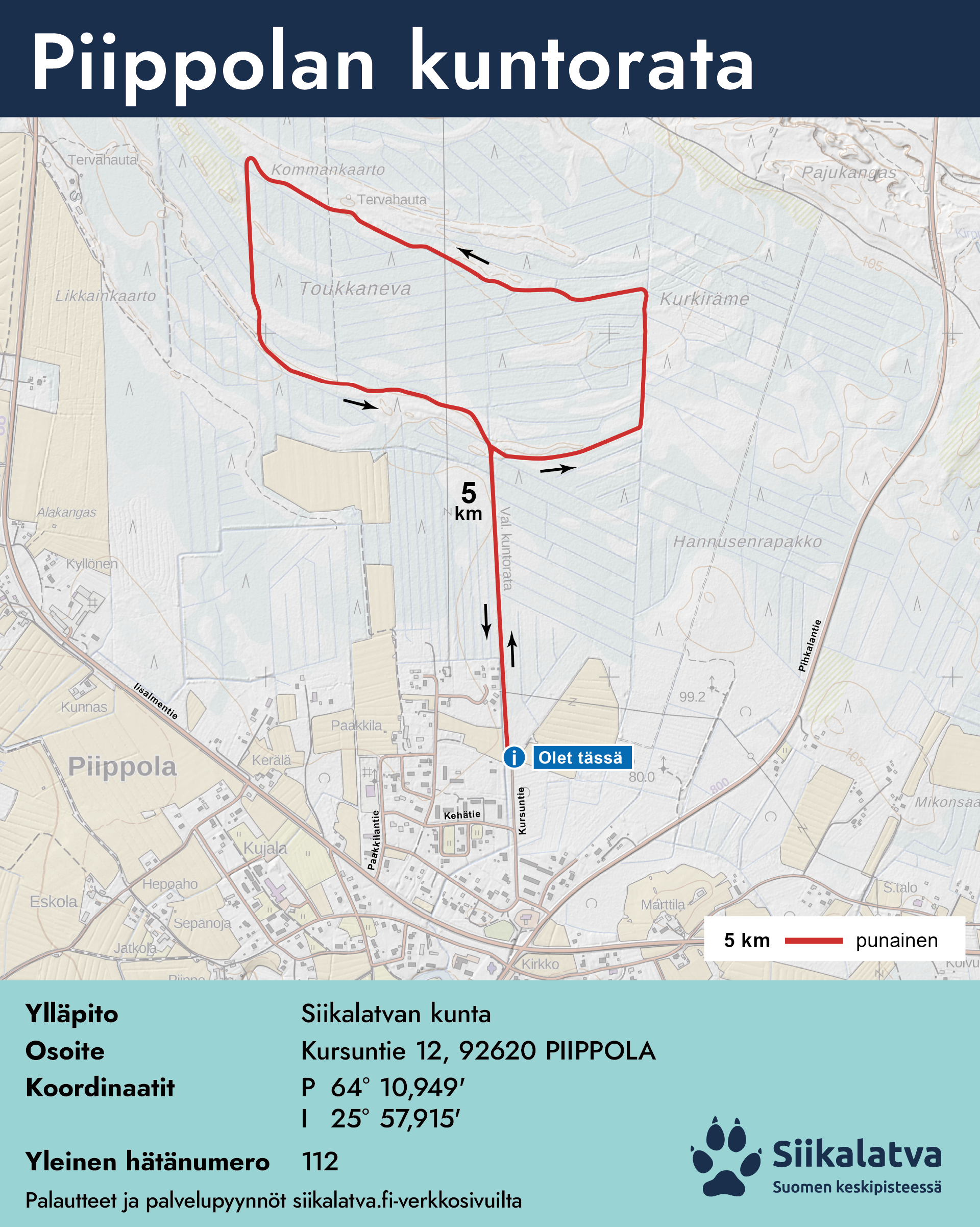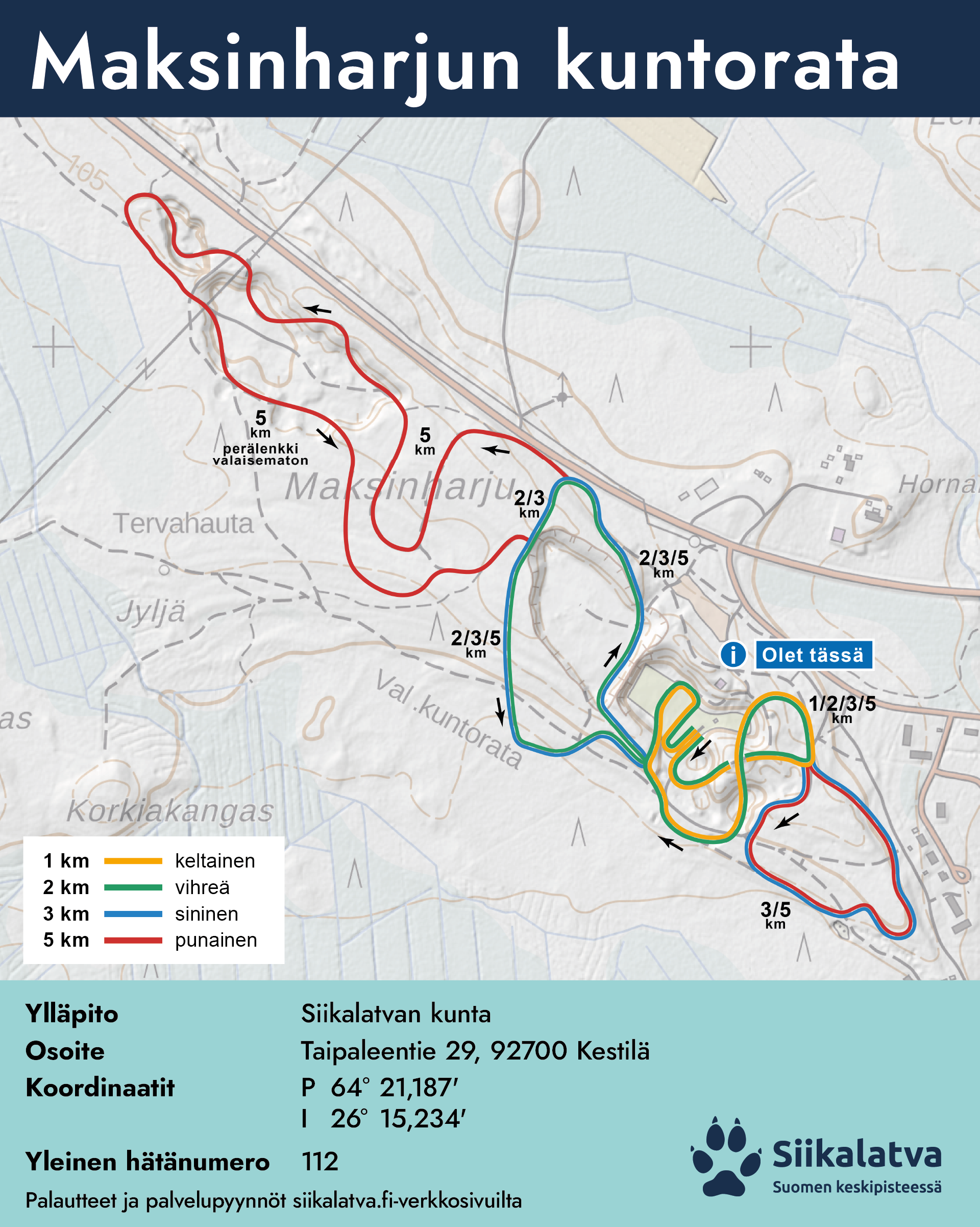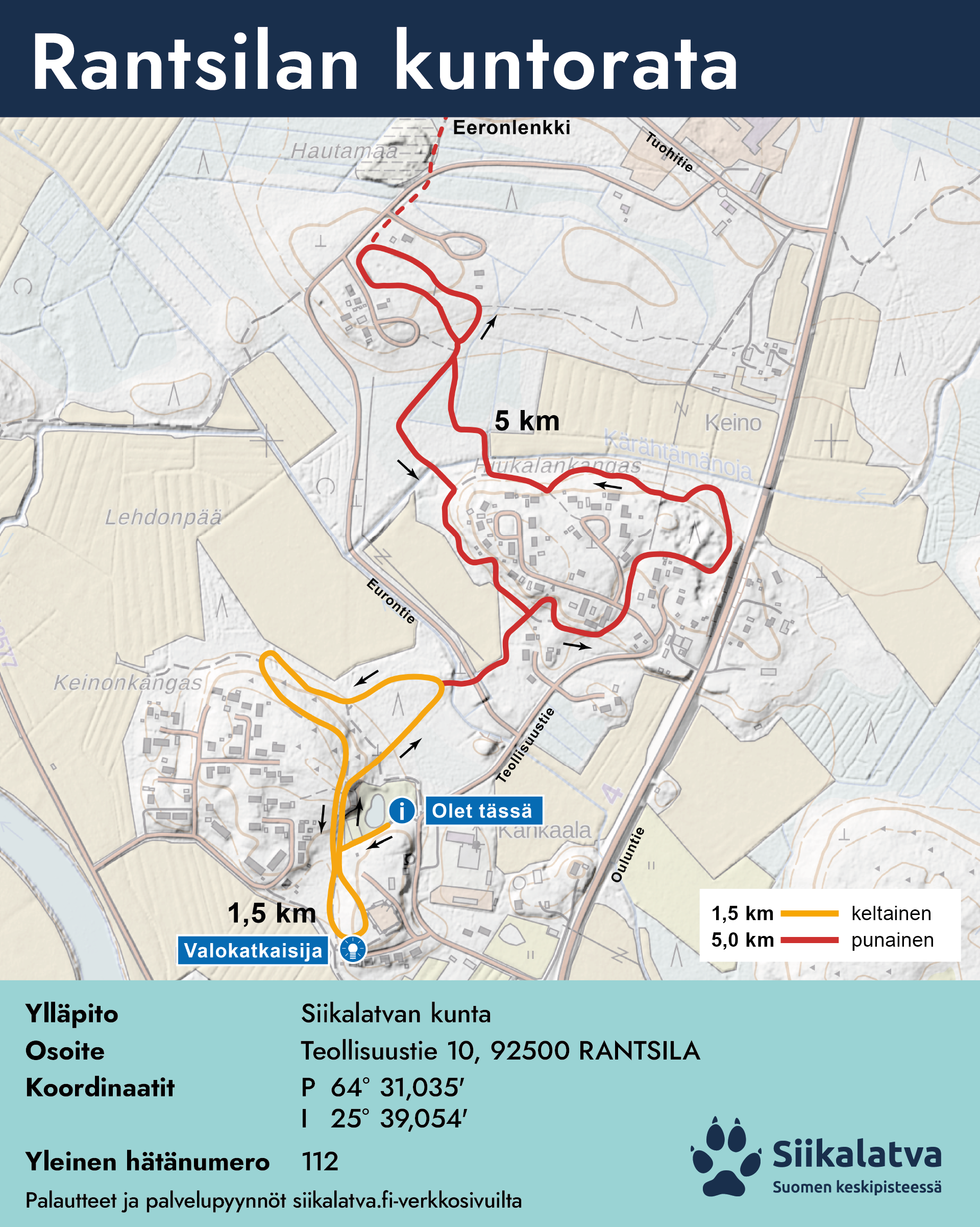 Valaistu kuntorata 1,5 km ja valaisematon 5 km.